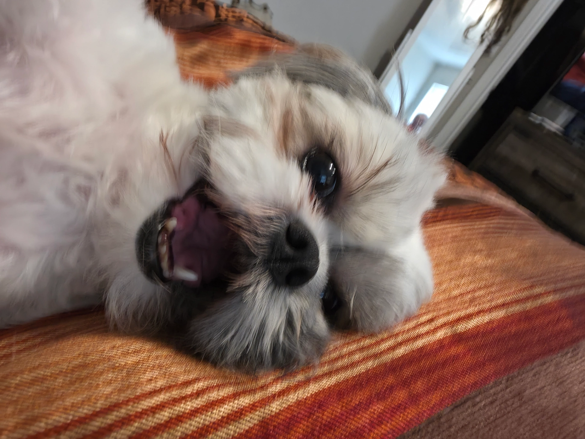 GreyBy is laid back. Sits and sits pretty. Will say "I love you" when prompted. She is a chocolate brindle and stark white mix. Kinda looks like a cow hide! Knows her commands. Very affectionate. Both house broke. GreyBy don't like the water. Is very verbal. Pouts when she don't get her way.