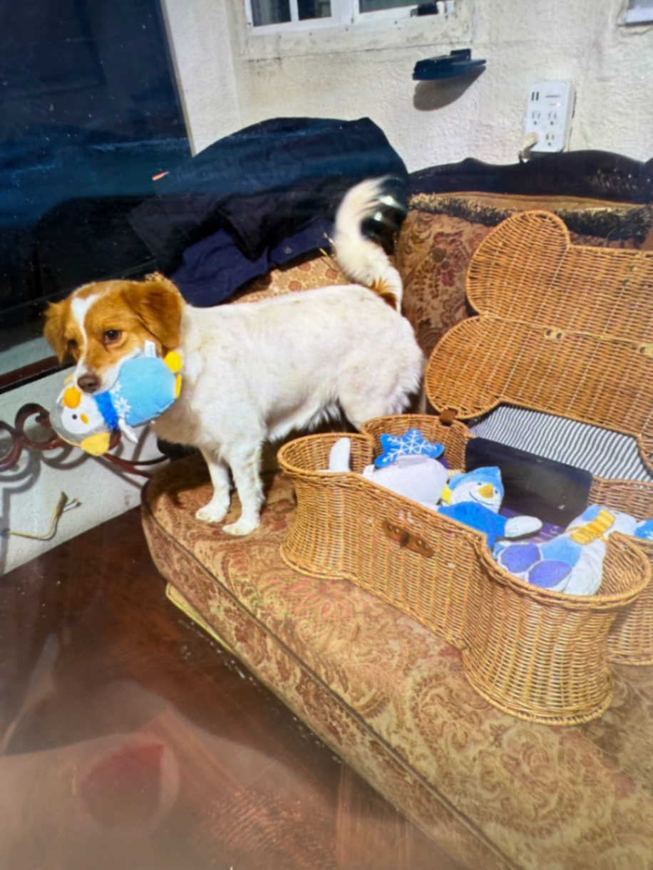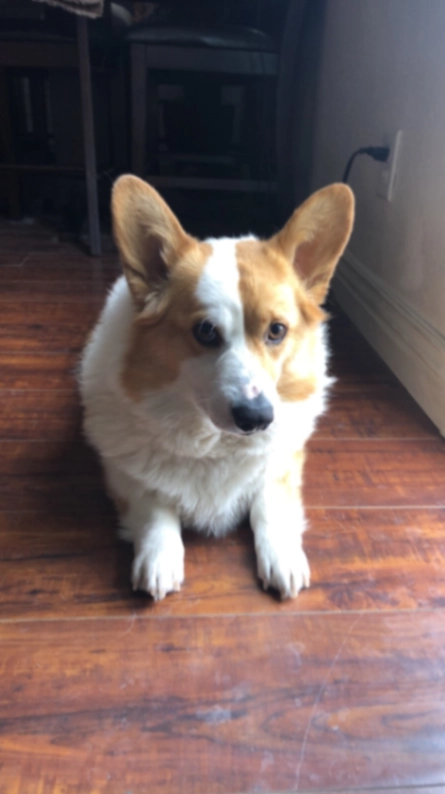He is a tan and white corgi. He’s 12 and barks a lot at people. He doesn’t have a collar