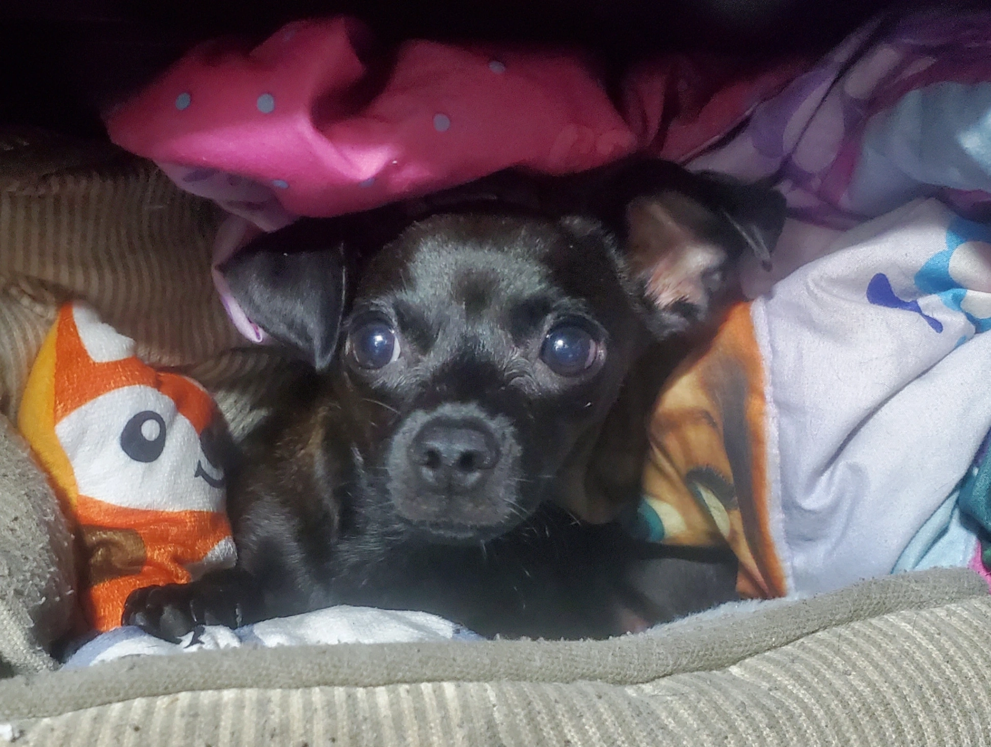 Deer head chiwawa she's all black and very timid when she runs she holds her left leg up