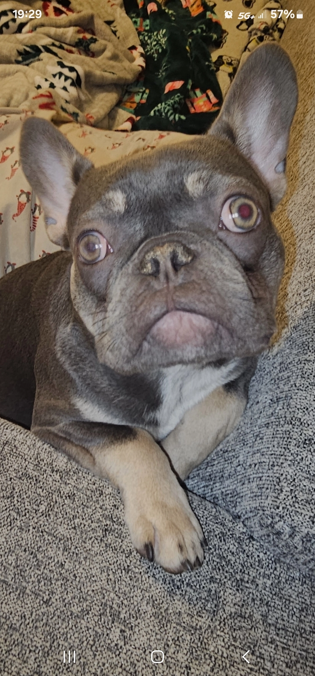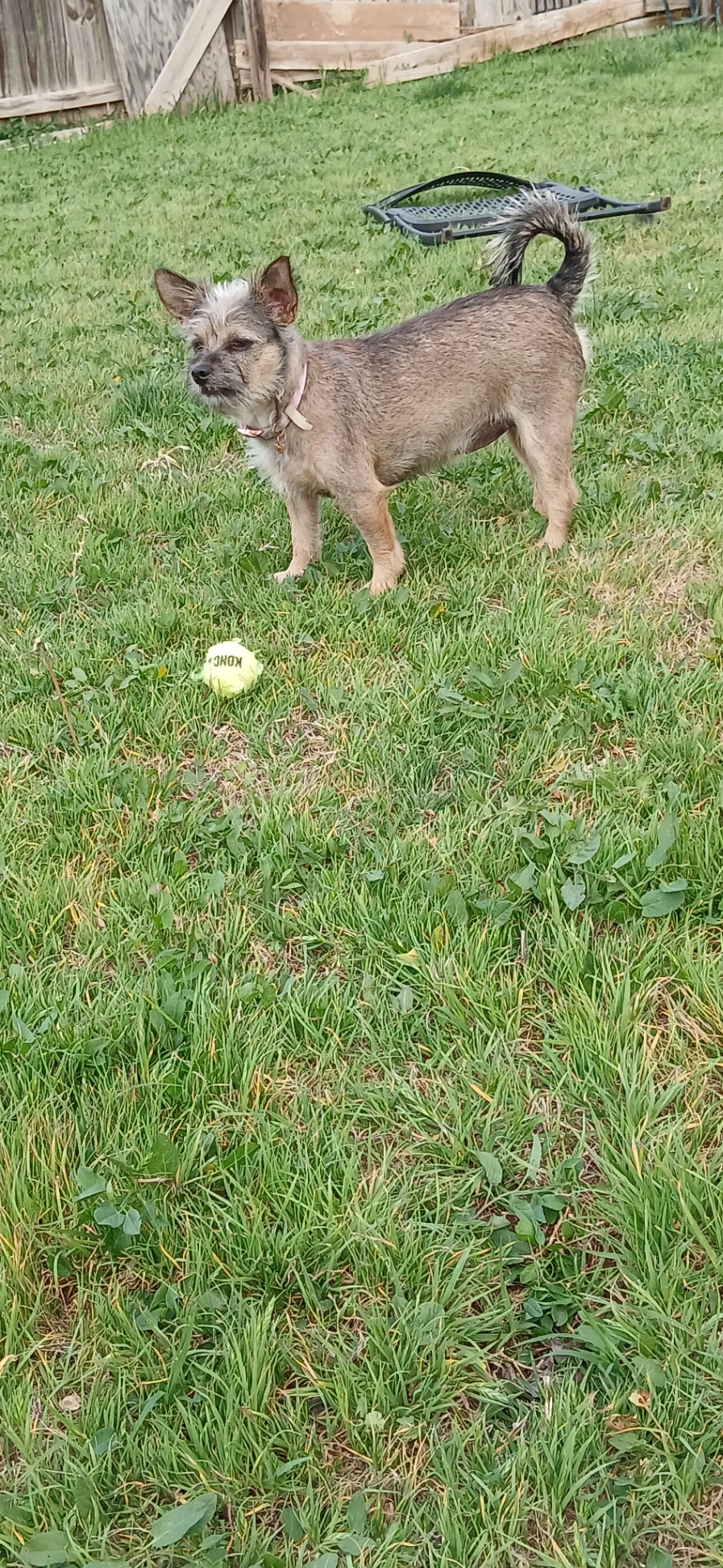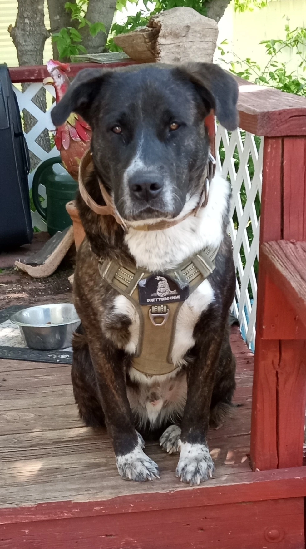 Brindle unaltered male with a tail that curls over his rear end. Very good tempered and friendly.