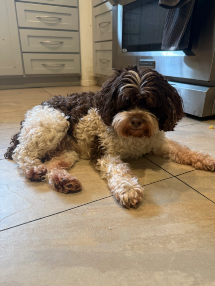 Female, 12 lbs, black top coat and white chest. She has a white ring around her neck.