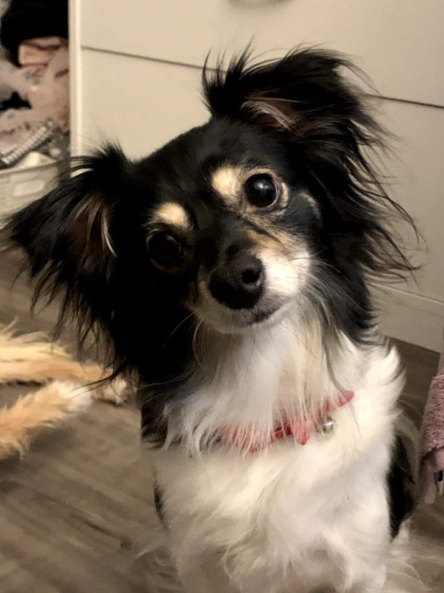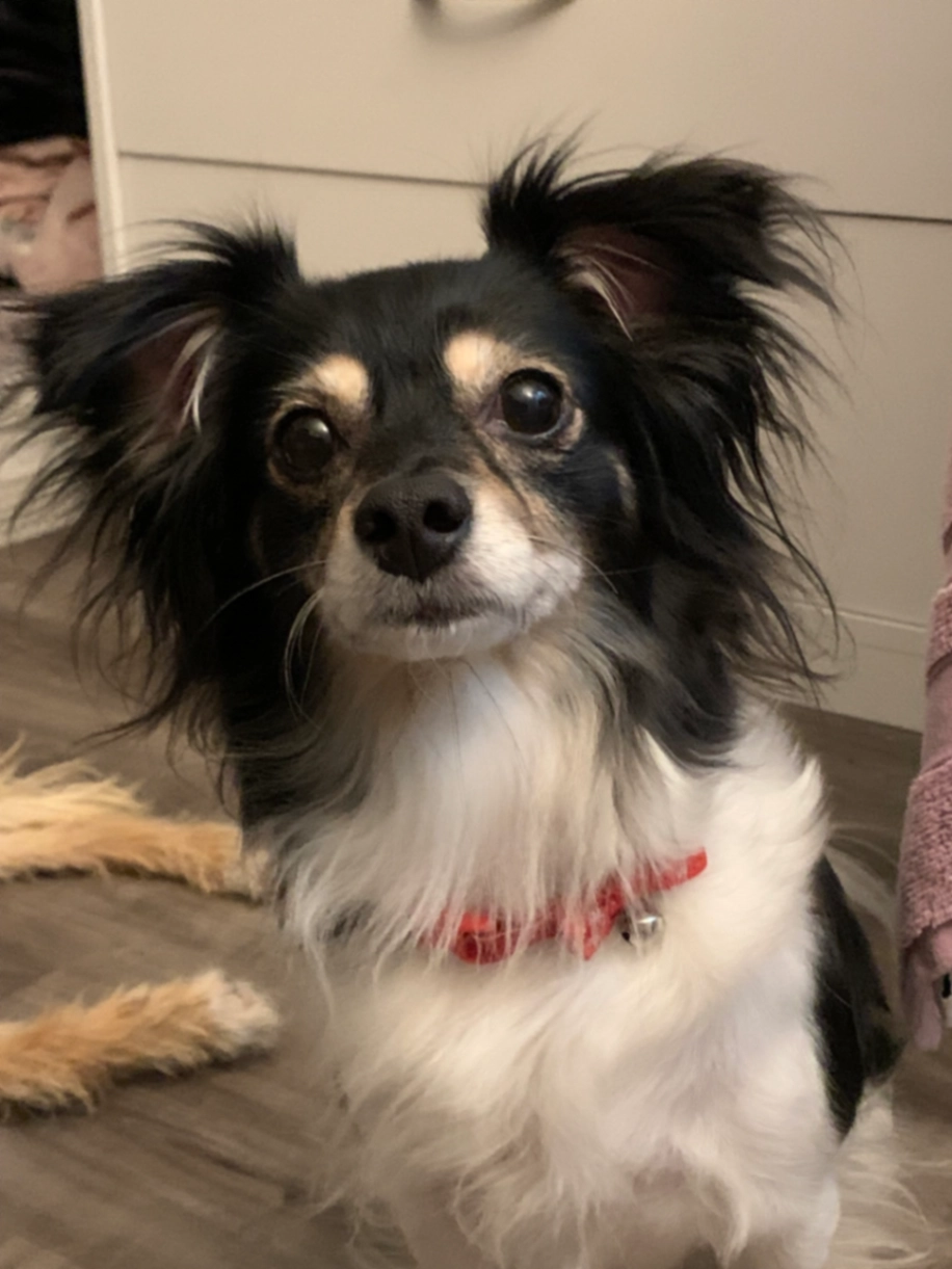 Female, 12lbs, top black coat with white chest, white ring around her neck.