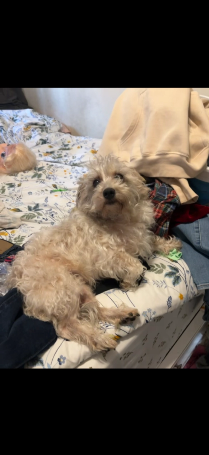 He’s gentle very scary dog, good friend, she’s good with kids and she have brown spots on her ears have silver hoody when she running away