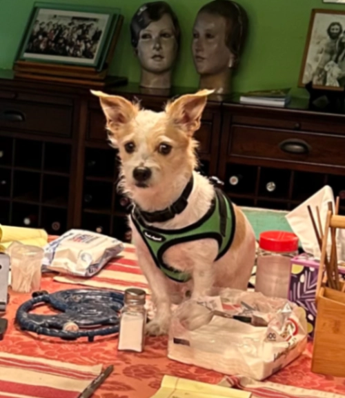 A very small dog with brown/tan spots wearing a black collar and green harness, a male, 15 lb mixed with Jack Russel, a rescue dog.