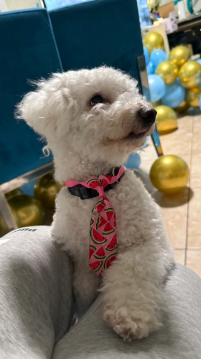 Macho raza Bichon Frise de un año de edad color blanco esa foto es reciente antes de que se perdiera anda con esa corbata de sandia