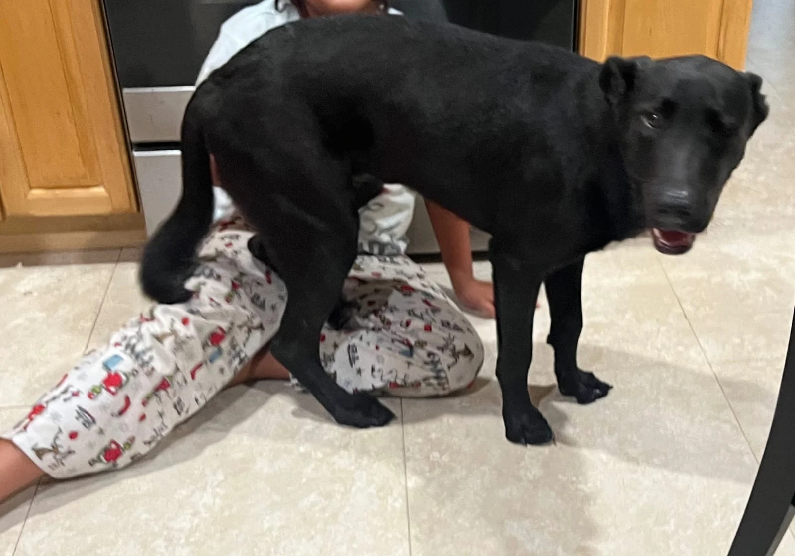 Very friendly and has a grey collar with a blue bandana from a dog cleaning service