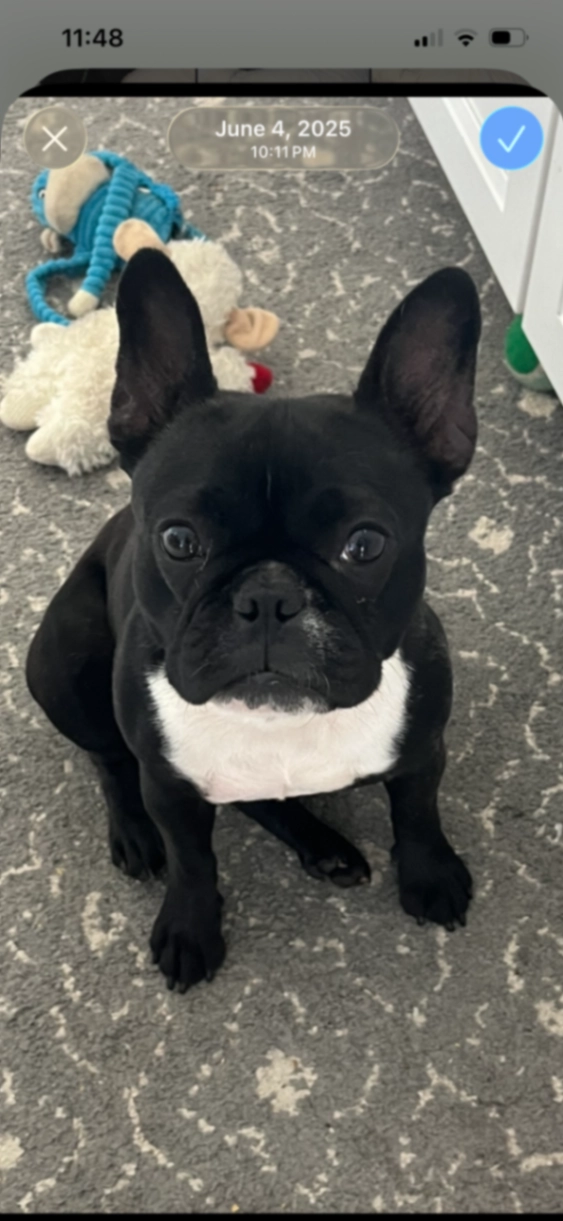 Black frenchie with white underbelly and neck