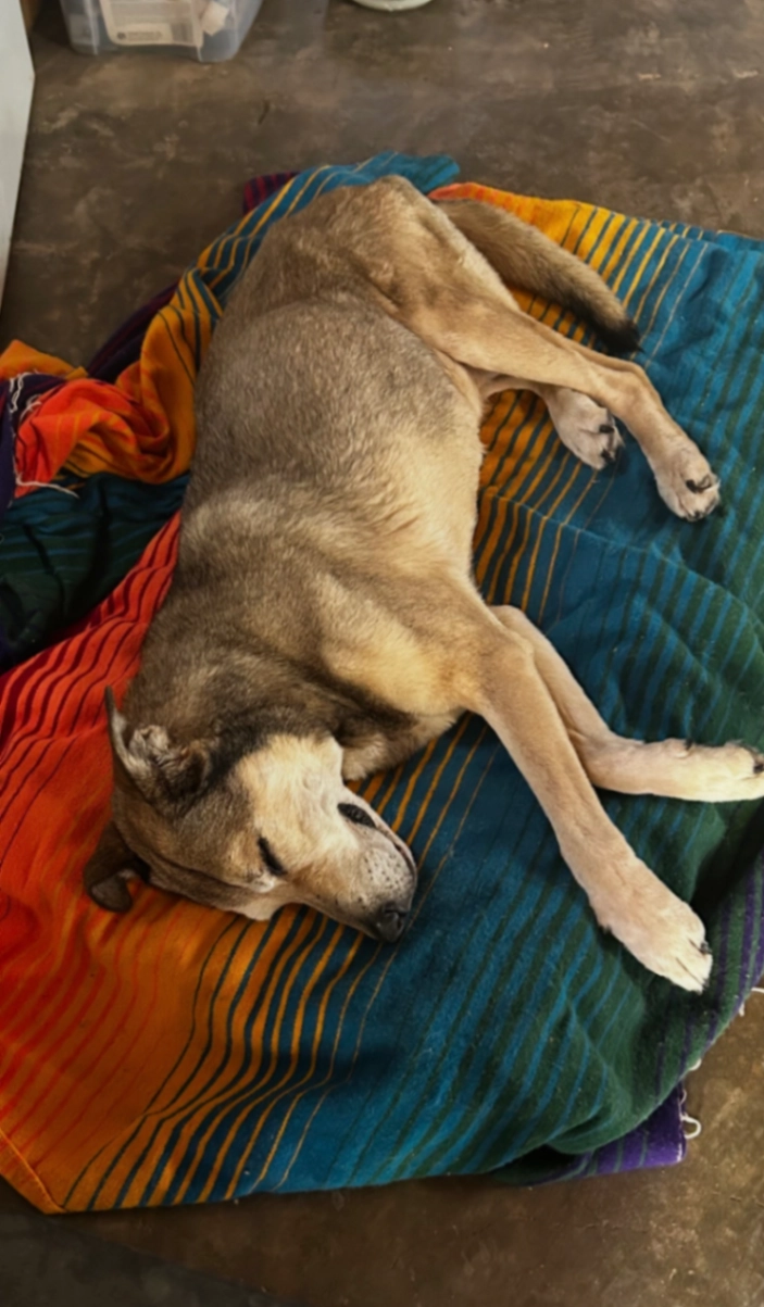 Shepard mix around 16 yrs old , very nice , med sized , hard of hearing and seeing , she old and please give her water right away if you find her .