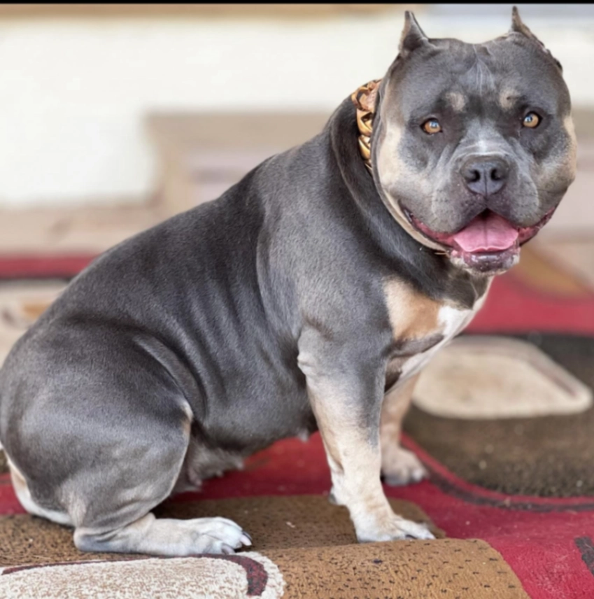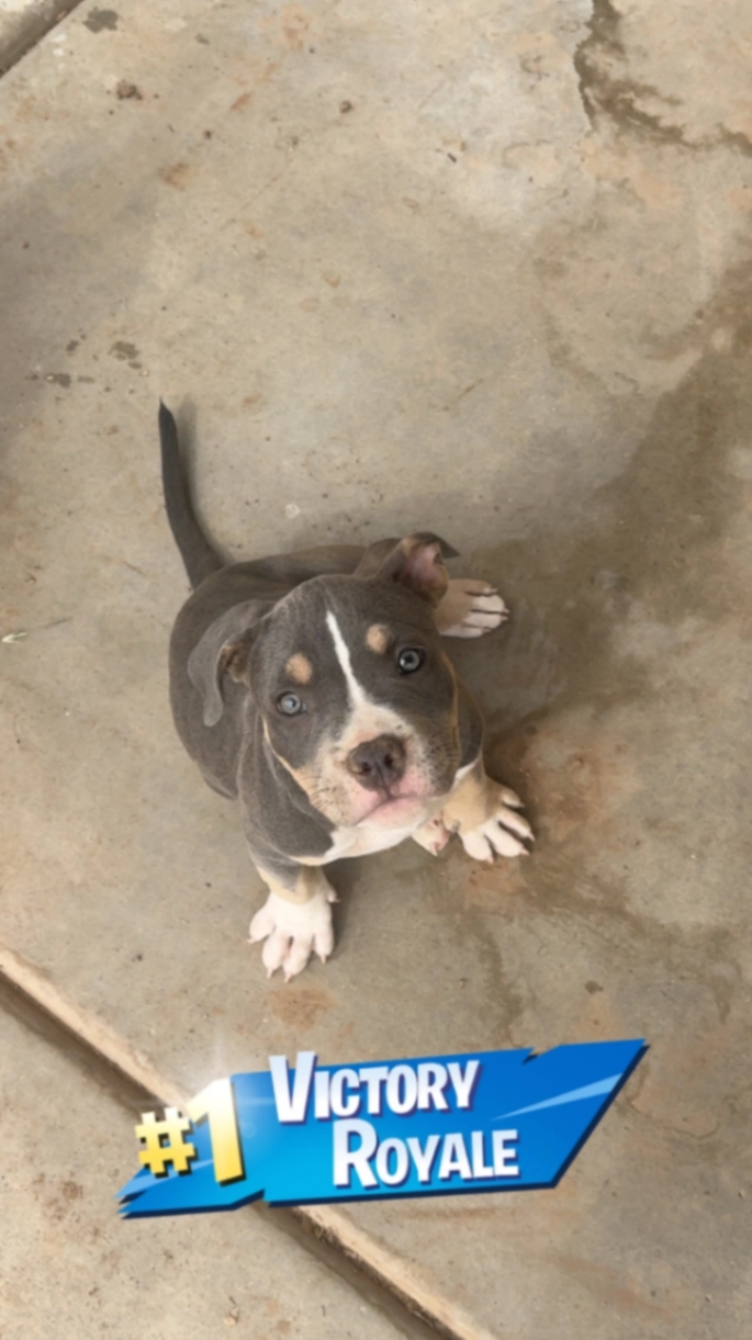 4 month old American bully gray with a white stripe in the middle of his face