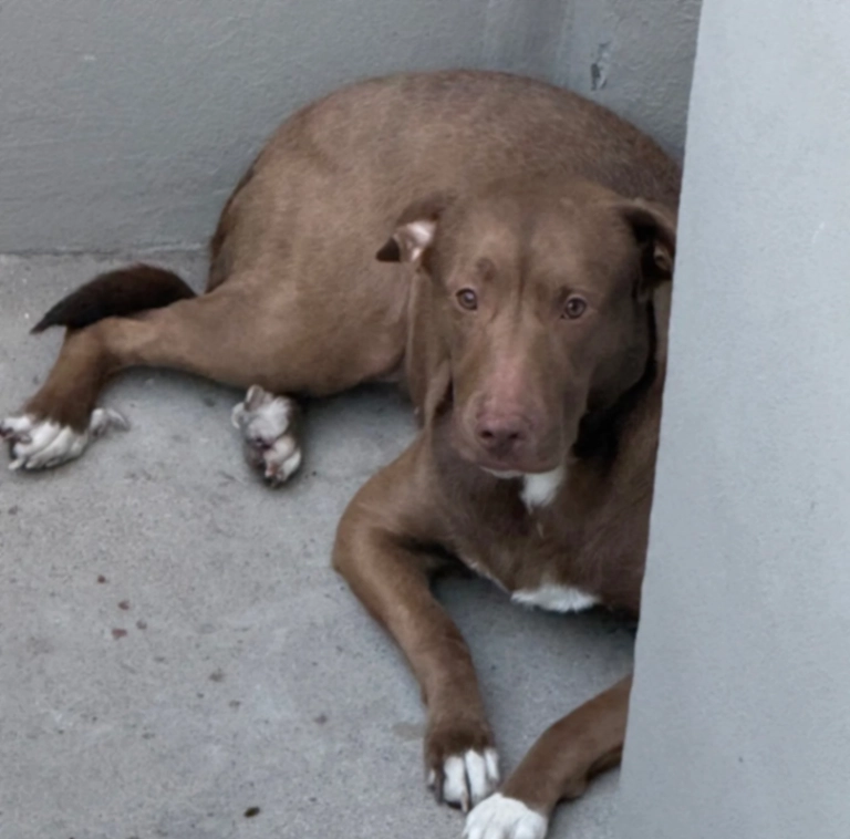 Husky mix brown with blue eyes, intact male, may be tethered to his brother who is also list