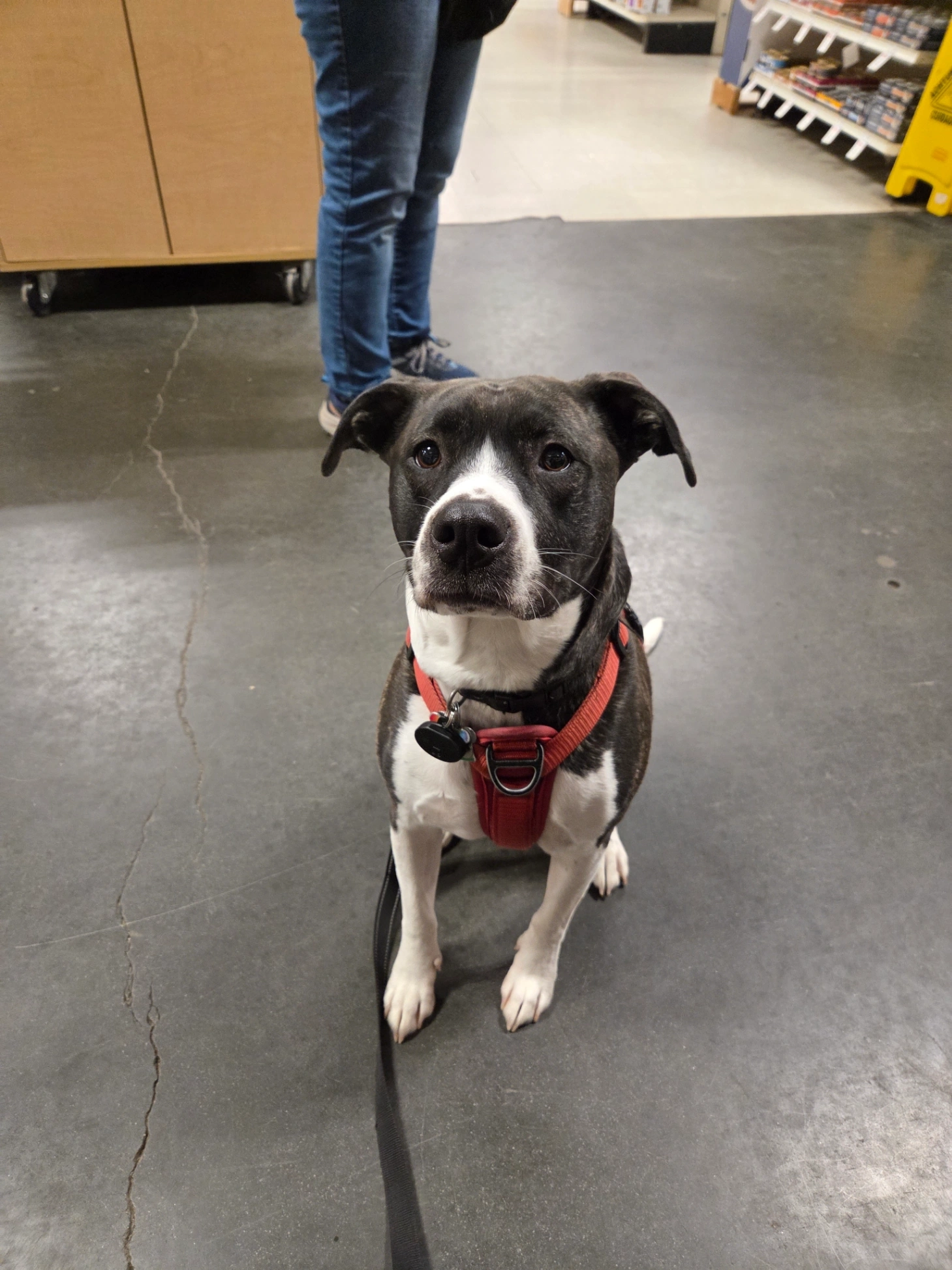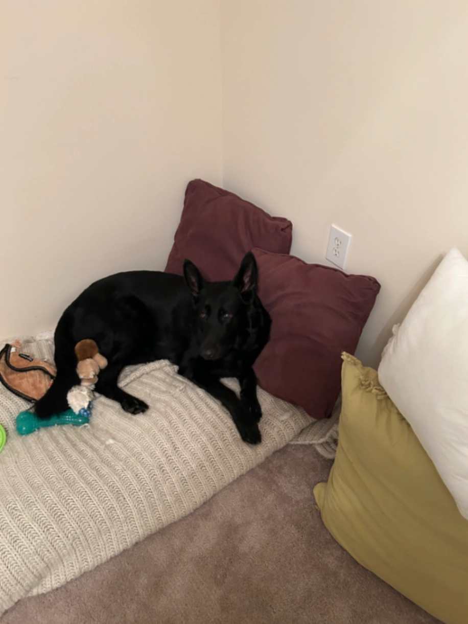 Hello, his name is Levi and he has on a silver linked collar with his blue and purple rabies tags. He’s relatively 90 pounds and is very sweet. He is dog reactive so if you’re walking with your dog and you see him, please attempt to keep them away and contact me so that both pets stay safe.