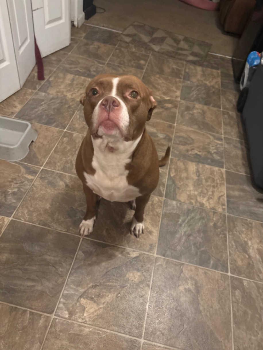 She said, medium size red nose, pitbull, very nice. She has a white triangle on the back of her neck and white on her underbelly the rest of her is brown. She’s not aggressive at all. She’s more than likely come up to you if you call her by your name. Please please please help me find my baby