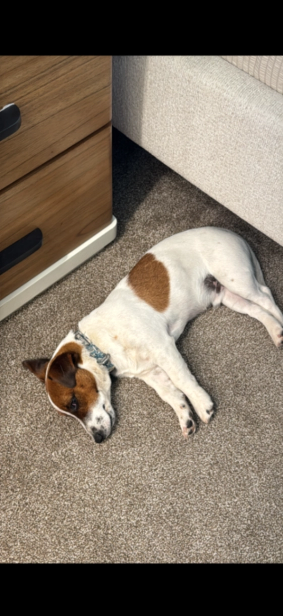 Perrito raza jack rusell, responde por el nombre de dollar, es muy sociable. Tiene una mancha en forma de corazón color café en su pierna.