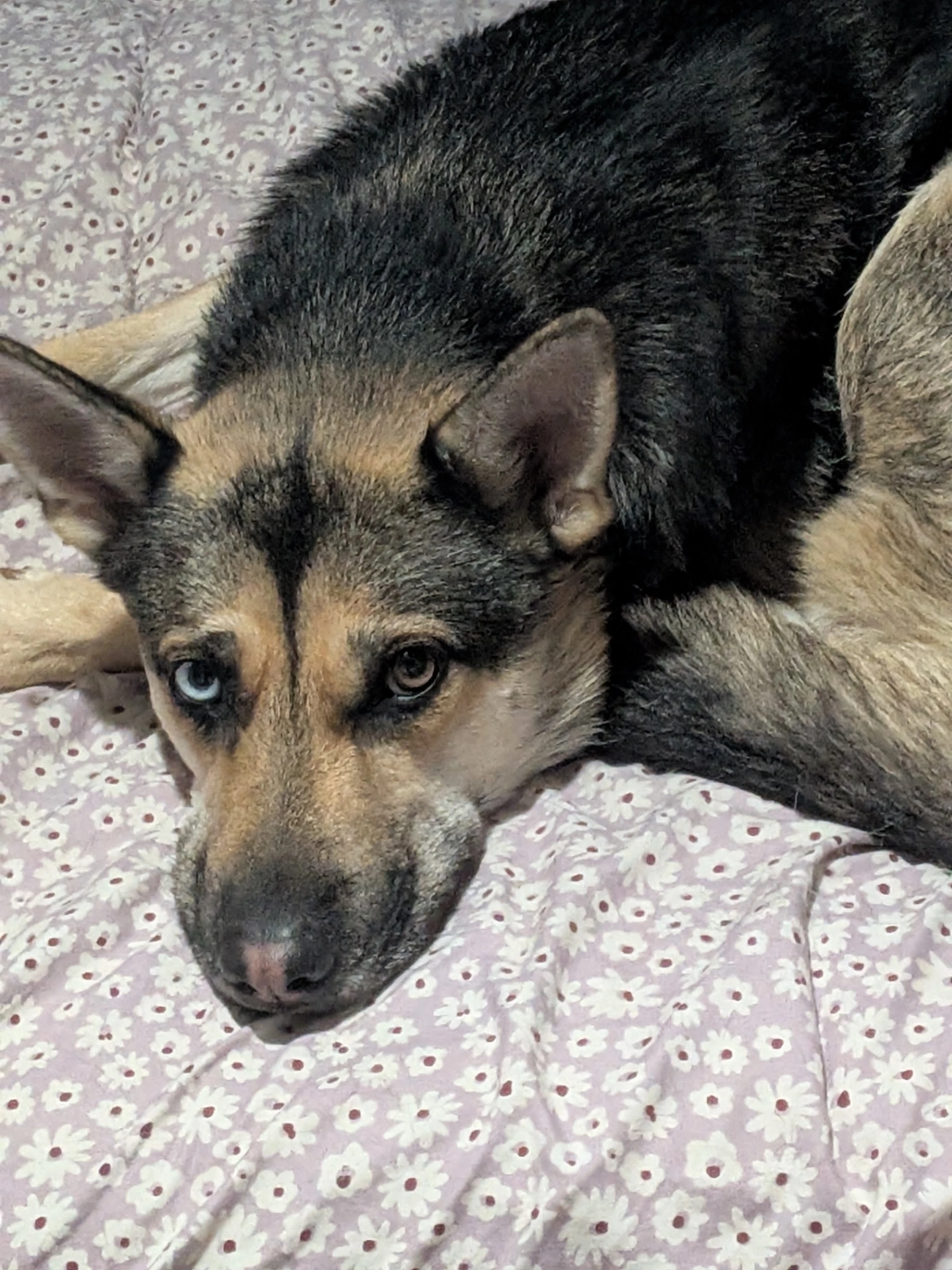 German shepherd husky mix with heterochromia eyes one brown and one blue.