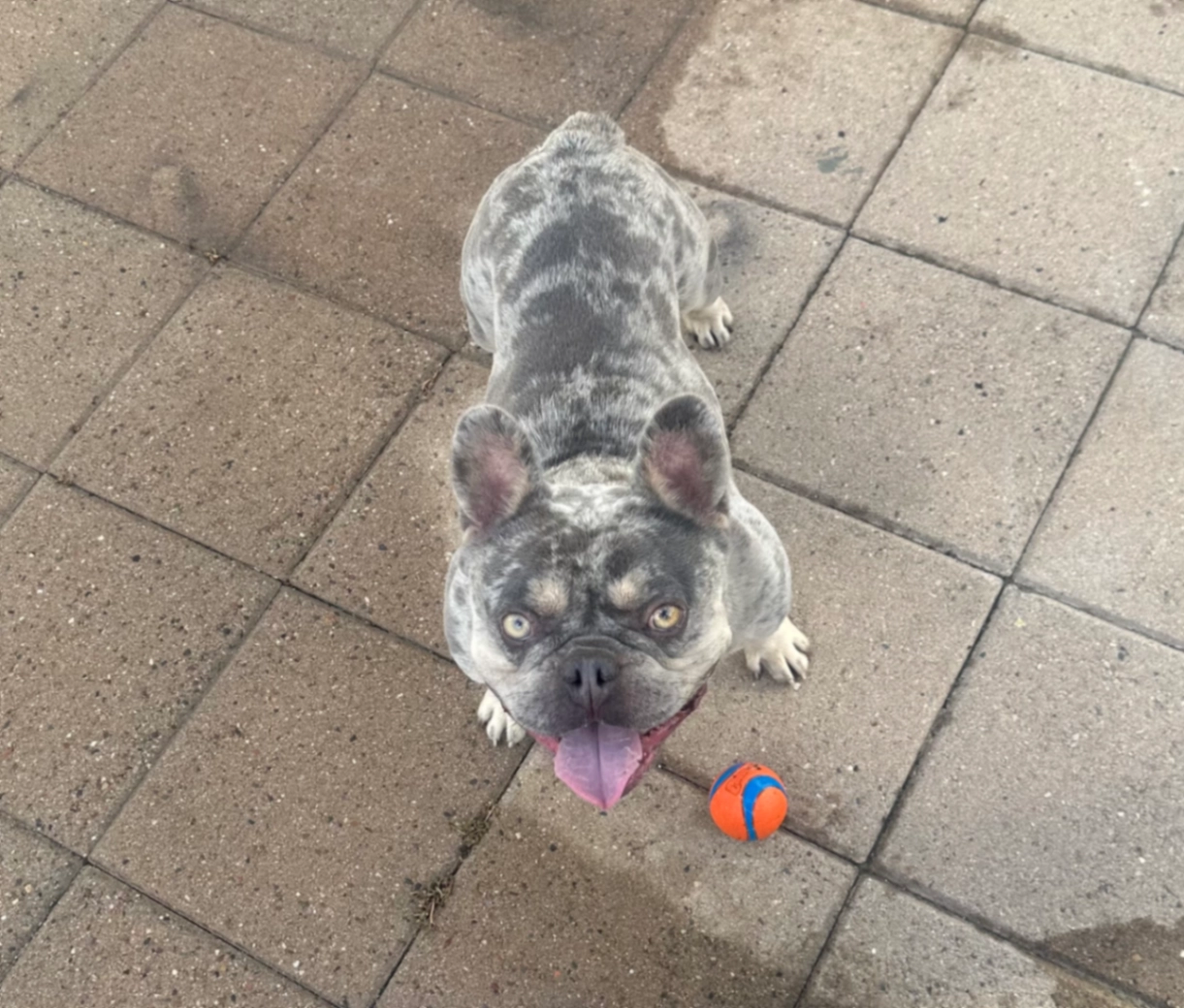 Blue merle coat (gray with darker patches), short and stocky build.