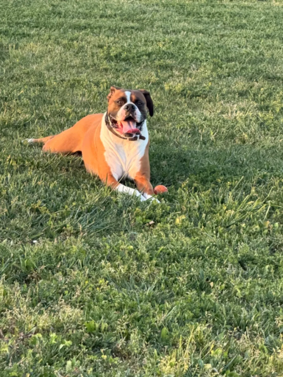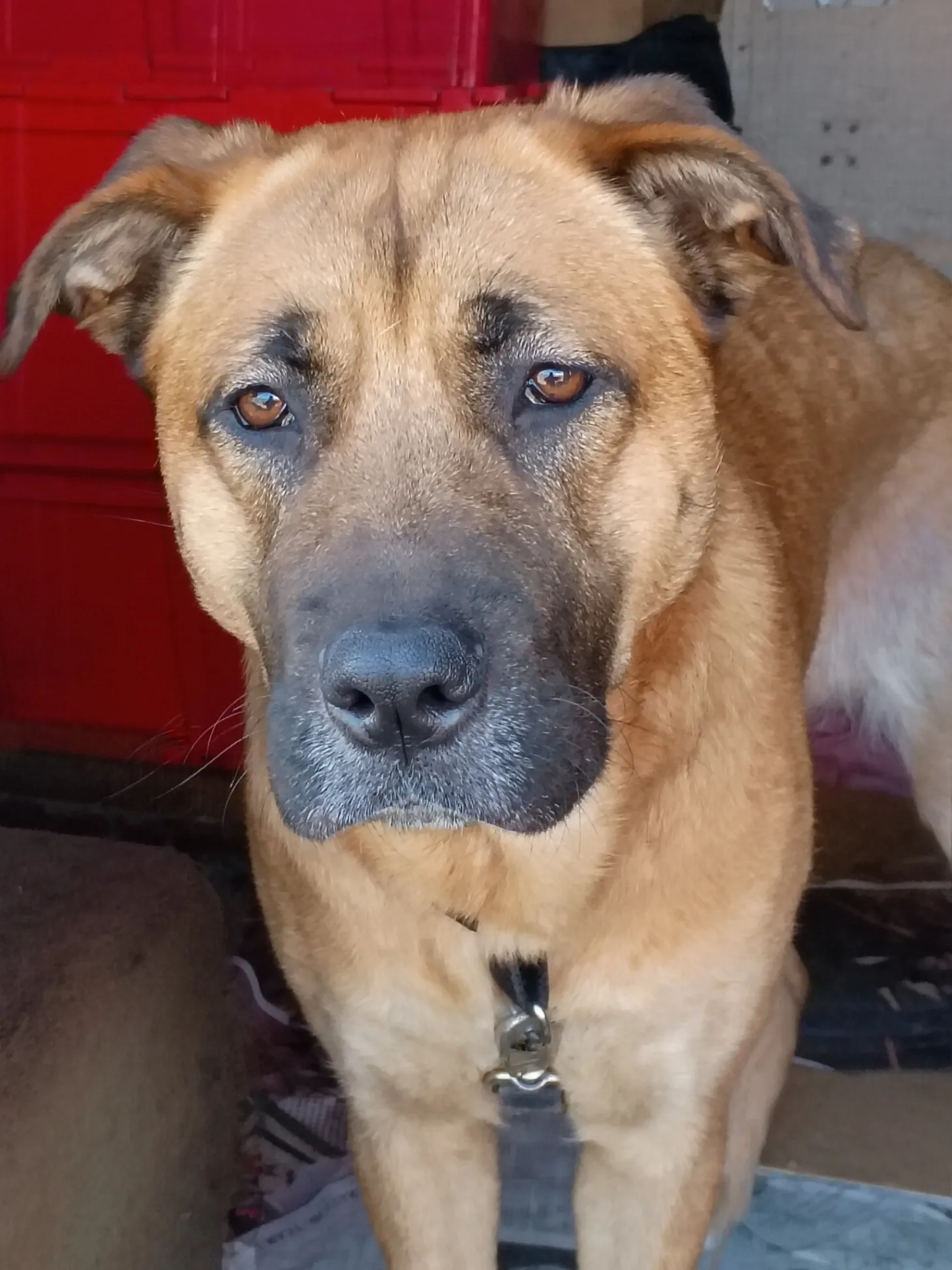 Female, not fixed, 1yre & 3mo. old,mastiff fawn short hair coat, very friendly, jumps up 4 hugs