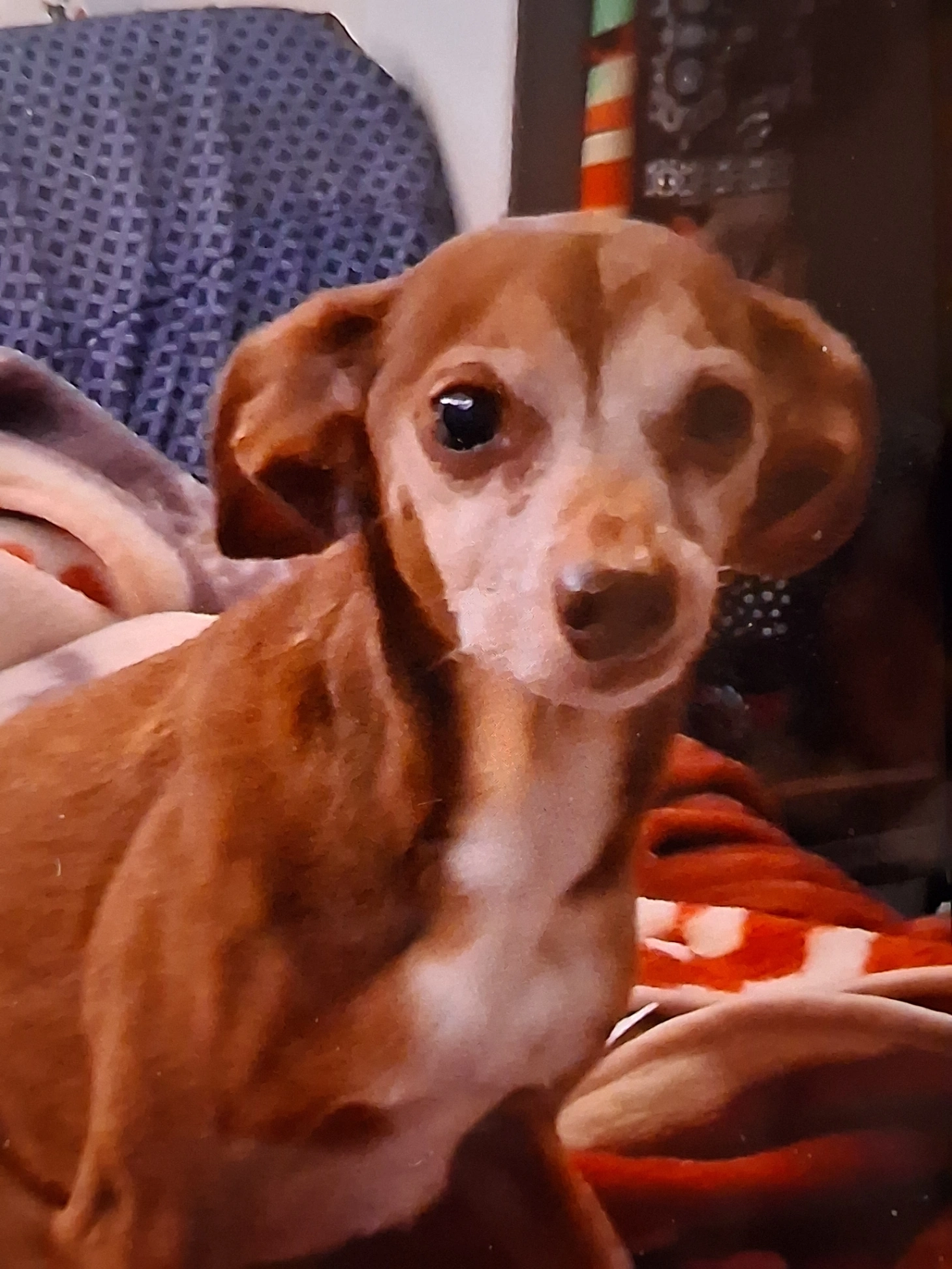 17 yr old Minnie-Pin/Chihauhau Mix Reddish brown with some white patches. Whitening face. Has tooth that sticks out and catches up on his upper lip.