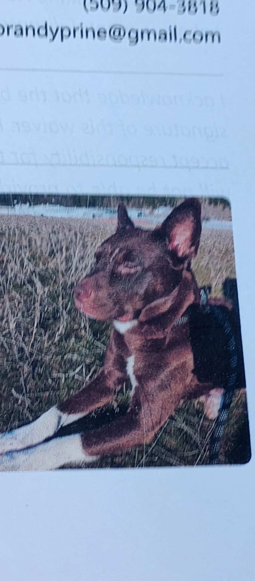 Khaos Bug is the brindle and white pup in photo. Comes to horse clicks and answers to khaos or bug. He is a service dog, but has separation anxiety. Wearing a green and black collar, licensed and chipped. Last seen at 1:45 pm today 3/15/26