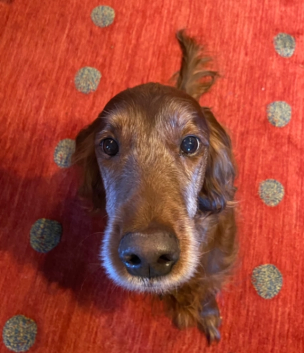 Coco is an Irish setter, medium sized dog with graying on her face and she has a turquoise collar and is about 45 pounds