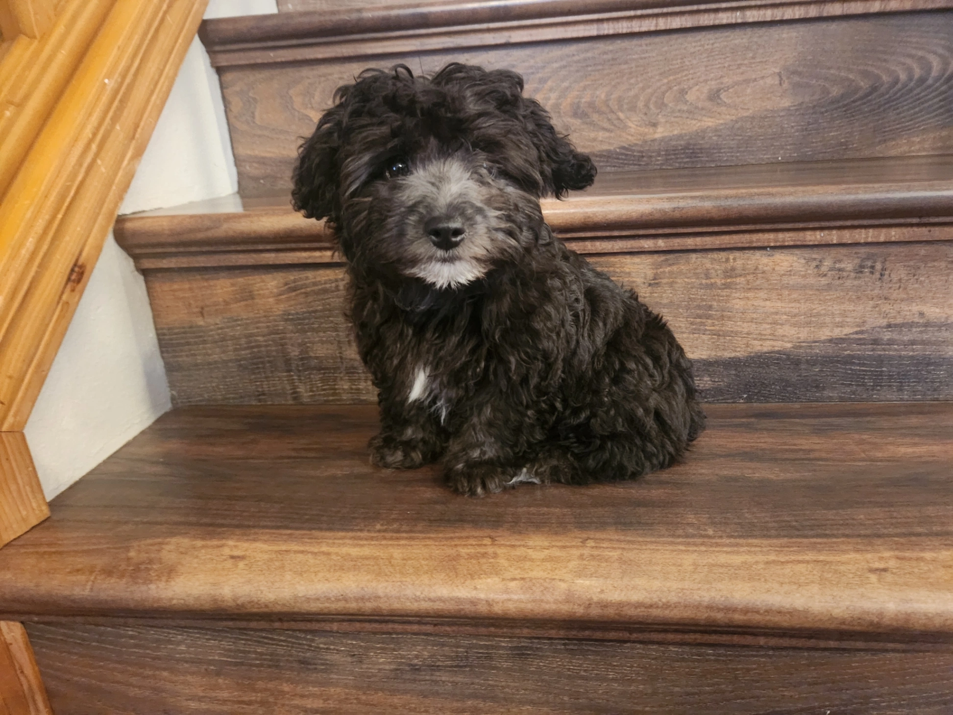 She is a 12-year-old toy poodle/Pomeranian mix, all black with gray around her mouth.