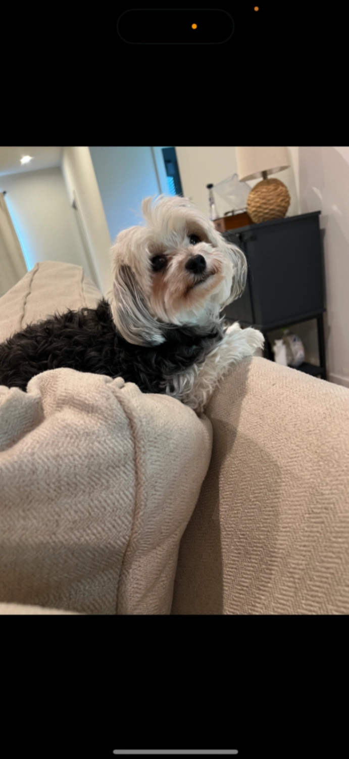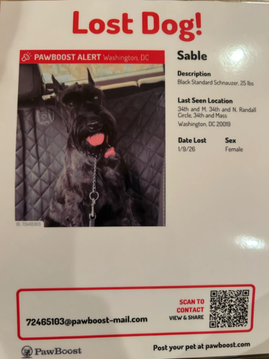 Five-year-old black schnauzer female roughly 25 pounds name is Sable, but also answers to Seattle. Black cloth/canvas 4 foot leash. Recently adopted skittish.