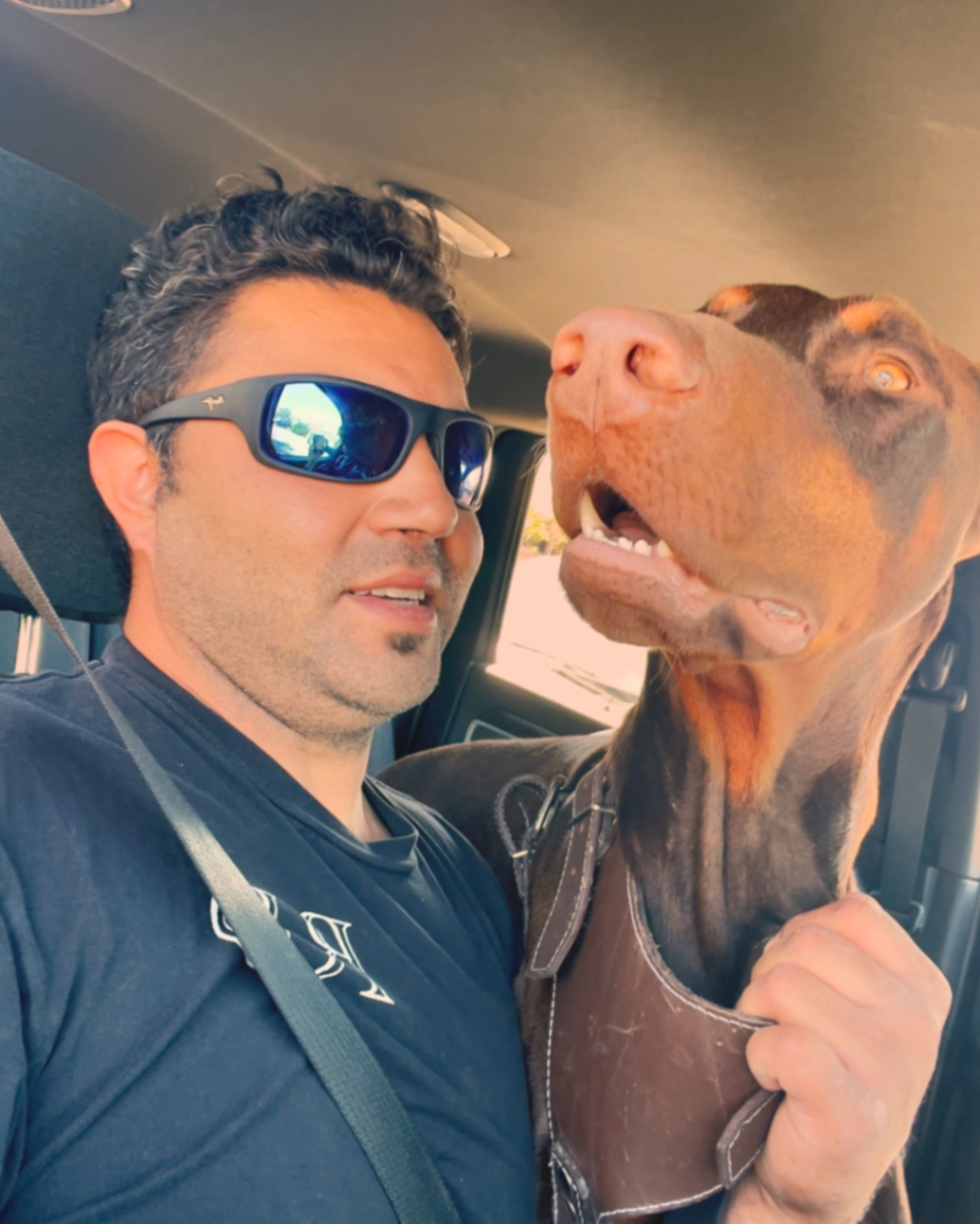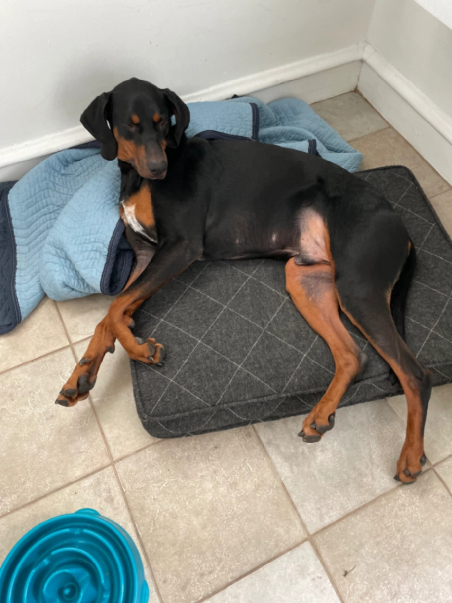 Doberman brown 2 years old saggy ears tail trimmed grey collar