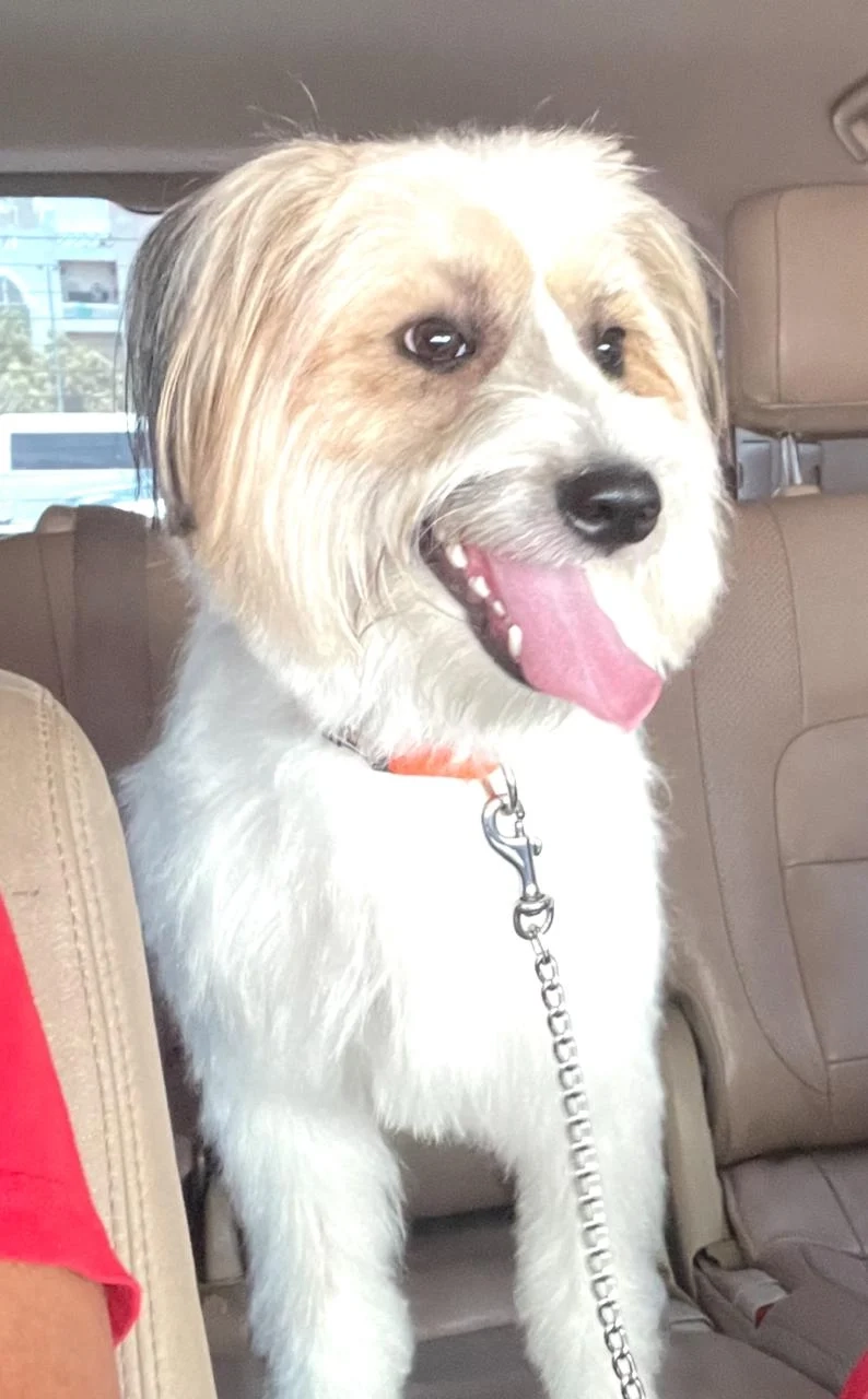 She is a friendly and shy dog, White and brown . She is micorchipped . loves to be around people but scared of loud noises