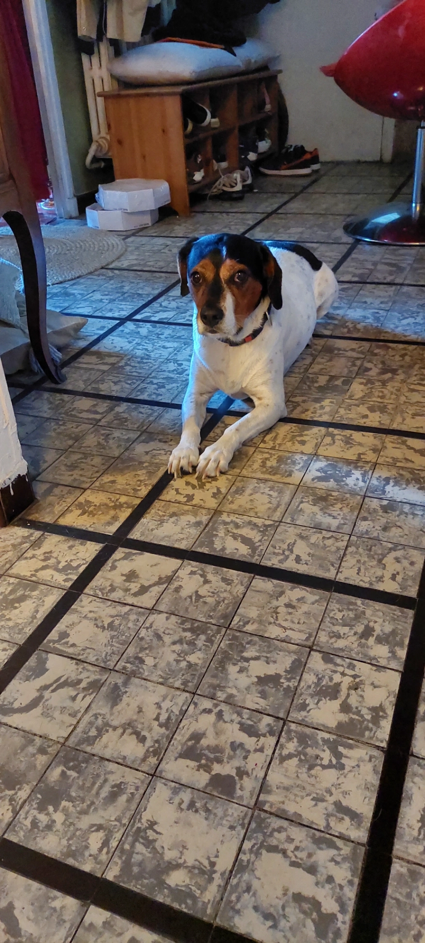 Chien. Tricolores en majorité blanc avec la tête noire et marron