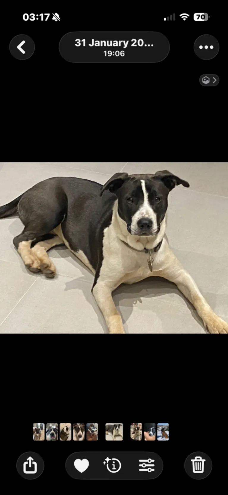 Noire, grise et blanche. peut être agressive avec les autres chiens. collier rose avec médaille