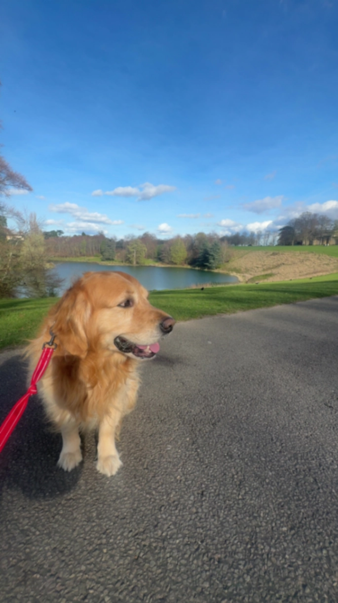 Golden retriever , not wearing his collar , quite big , answers to shambles