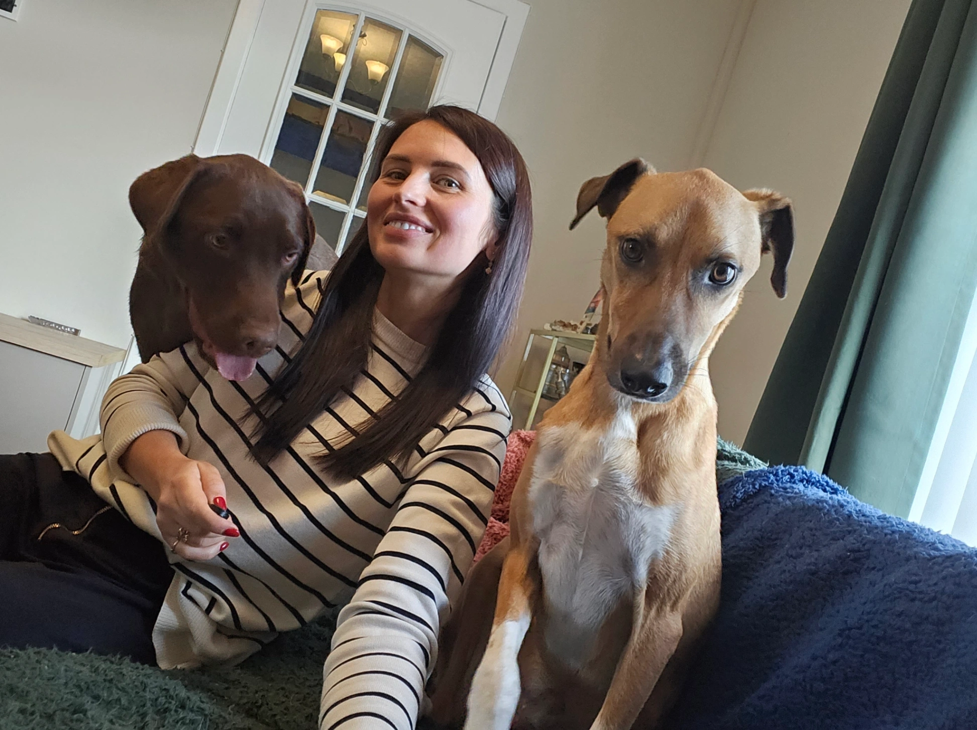 Leo (chocolate Labrador, 3 years old), Cody (rescued from Qatar mix breed saluki, approximately 4,5 years).