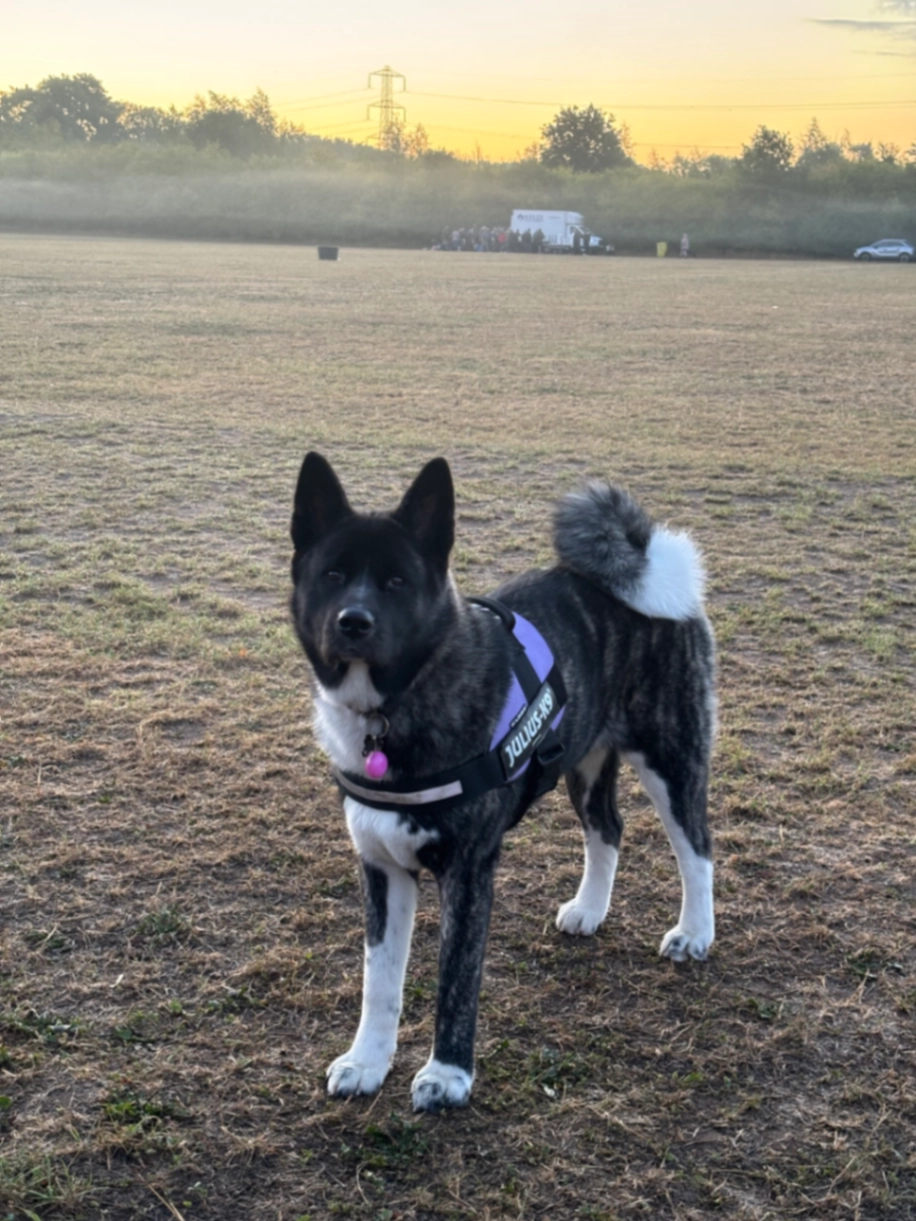 Roxy is black, white and brindle. Roxy is microchipped