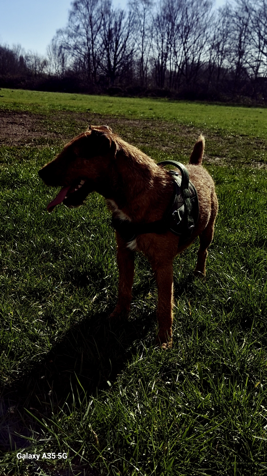 She has no collar as she slipped out of her harness she has brown eyes very small and very timid often goes to ground when approached or if someone tries to pick her up and she is very fluffy