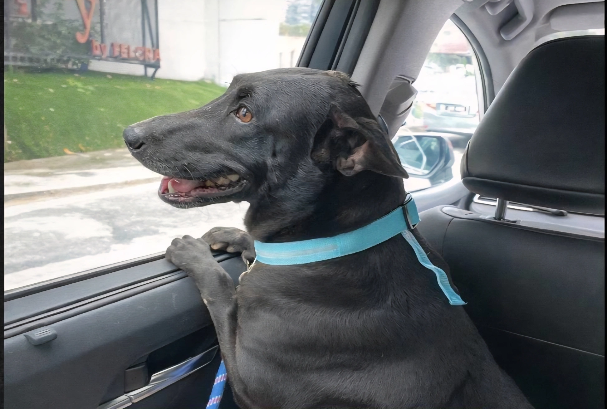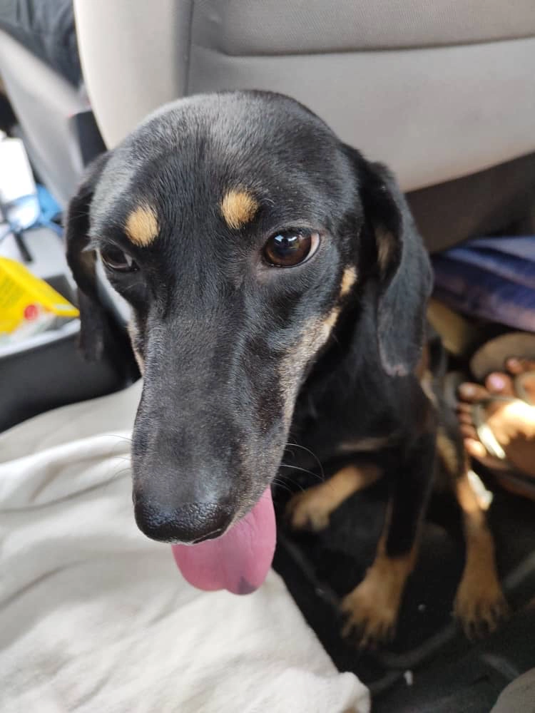 Black dog with tan markings and collar with my telephone number on it, also microchipped twice