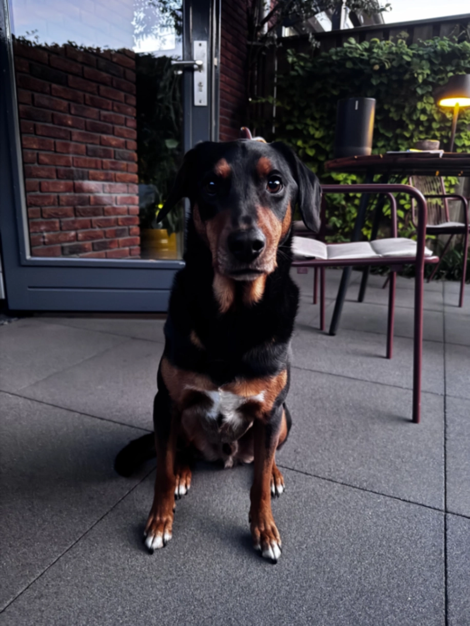 Pacco, 1,5 jaar zwart met tan, kent de omgeving niet. Blaft naar andere honden maar is lief voor mensen en kinderen