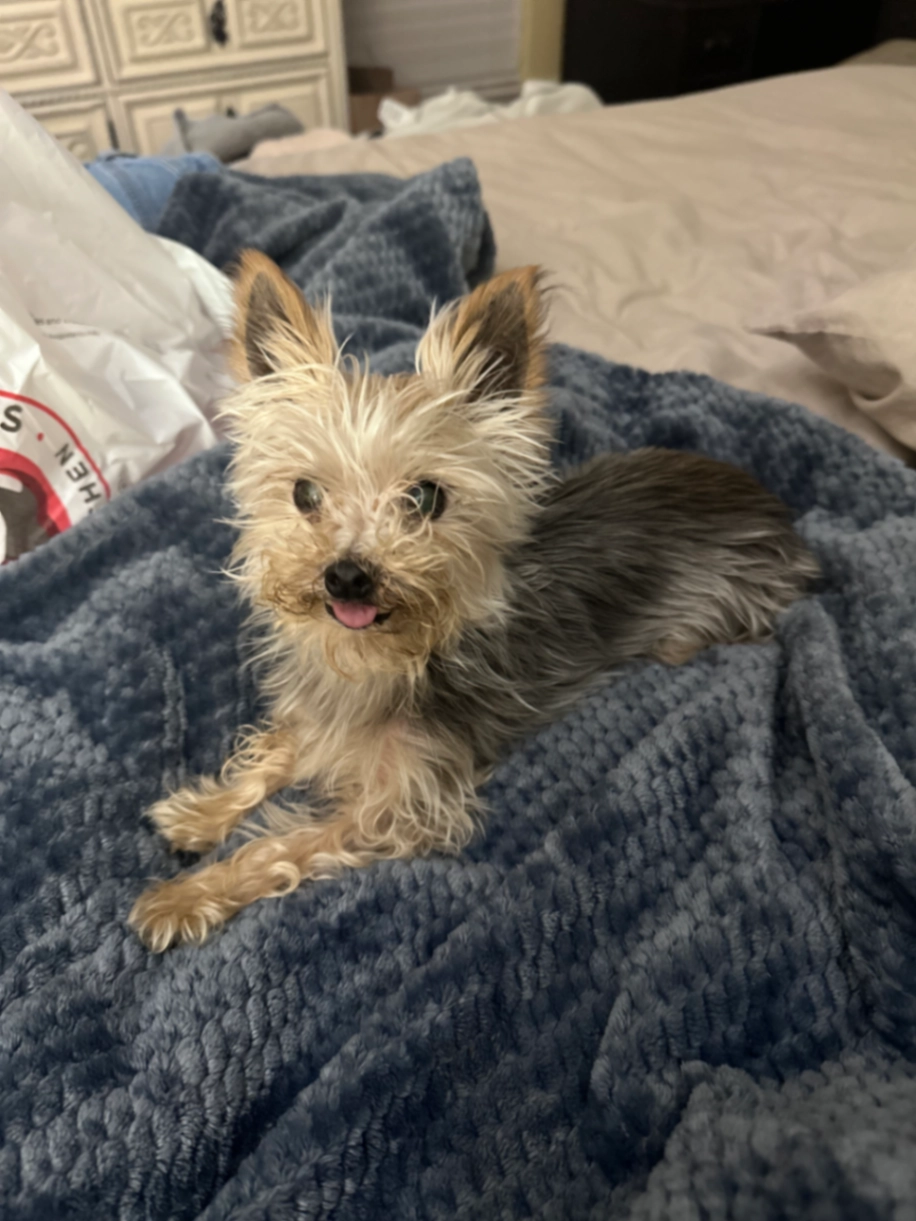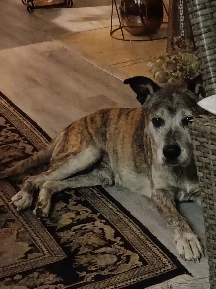 3 lbs grey, black and brown has a hard time seeing and hearing