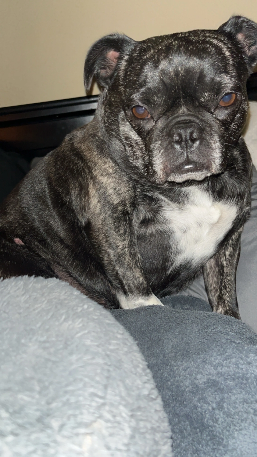 Lola is a small brindle/black pug with a white chest and some gray around her muzzle right white paw She is very loved and may be scared