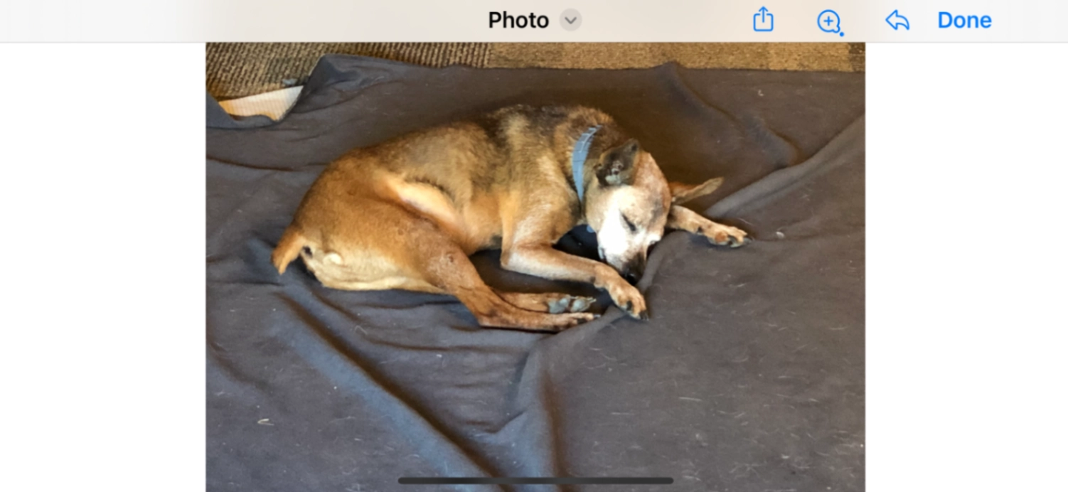 Fragile, skinny kind and gentle rust colored with a gray face, blind and deaf with a growth on ear and a stub tail