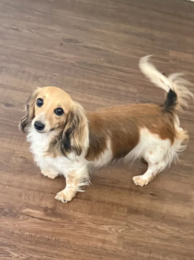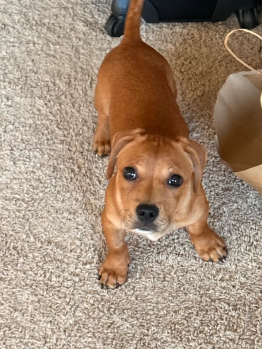 He is a brown puppy, he is only four months old, he is very friendly and if you see him, he will probably jump on you.