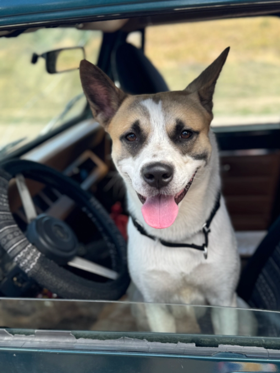 Asher is a 4-year-old Akita/Lab who is mostly white with brown markings on his face, ears, and rear. He may be skittish but very friendly. Howls/cries when alone or feeling lost.