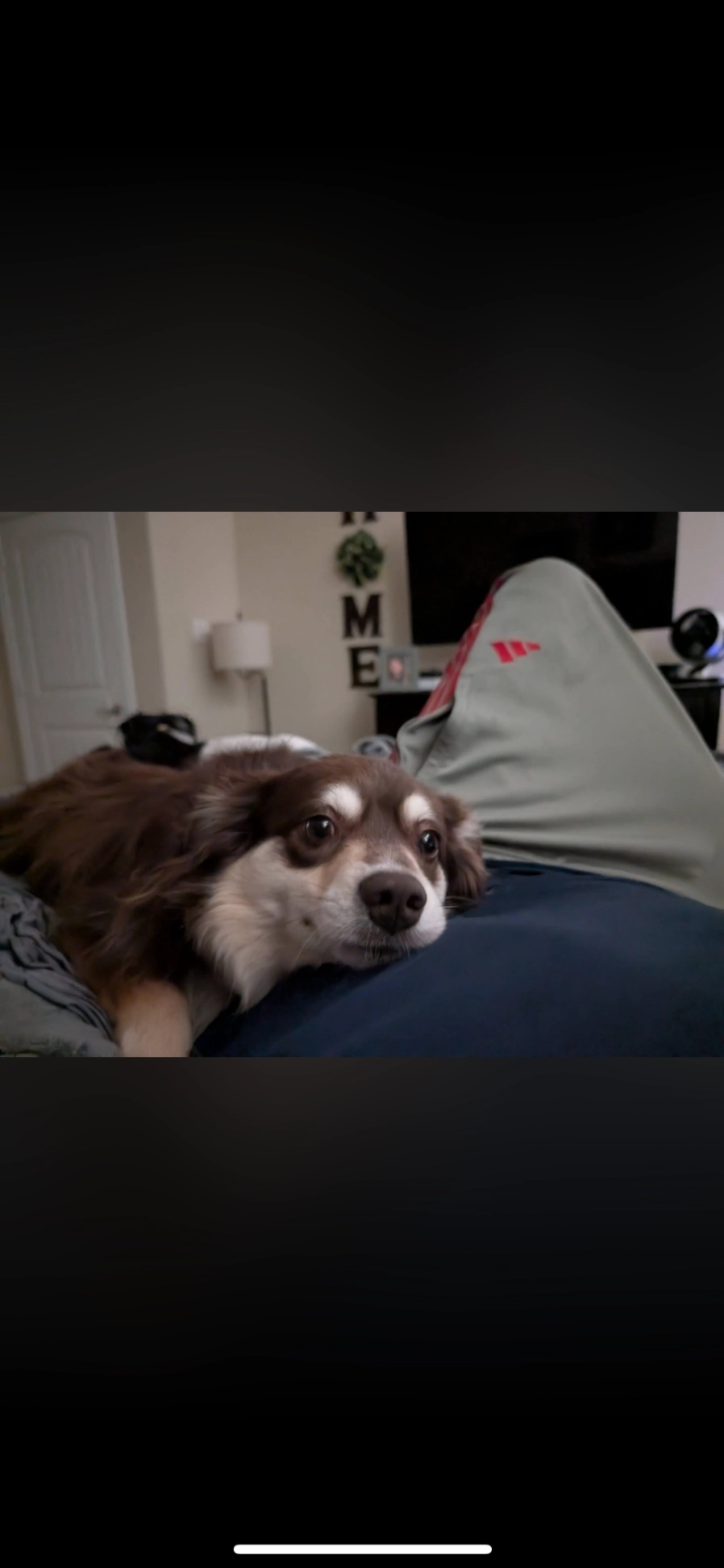 30 pound mini Australian Shepherd. Chocolate coat with white blaze down her face and cream above her eyes which are hazel.