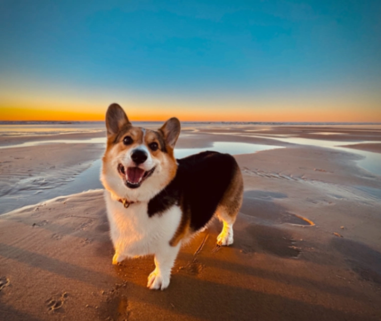 Short and chubby with a black back and a white and brown face