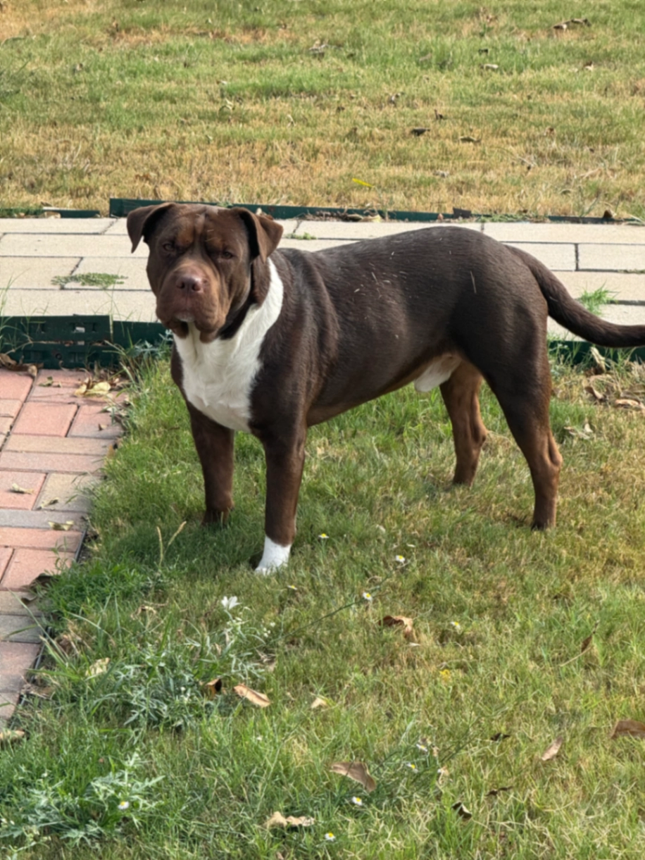 Draco is a brown pitbull mix . He has white fur chest and paws. Has a skin tag that hangs from his armpit area