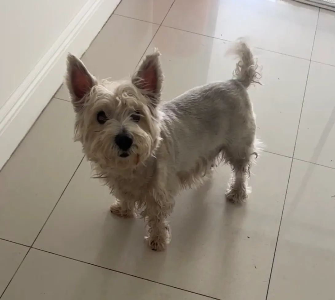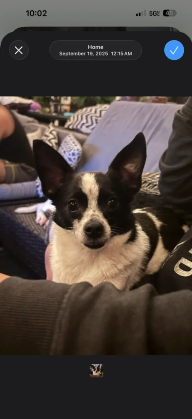 He is half chihuahua/half Pomeranian (pomchi), 7-10 lbs small dog, white with black spots. He looks a lot like a chihuahua though. He barks a lot but he is nice