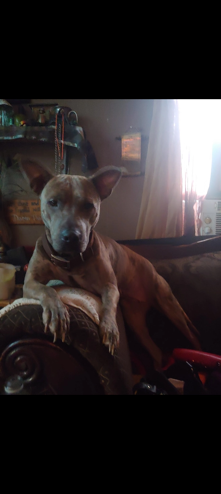 Anastasia is a light brindle. Ears stand up. She's temperamental but sweet. Does a dino dinosaur kind of growl when she wants you to notice her. Doesn't like her feet messed with. Loves playing in water. Scared of storms. Has anxiety attacks. She sits and sits pretty. Knows all her commands.