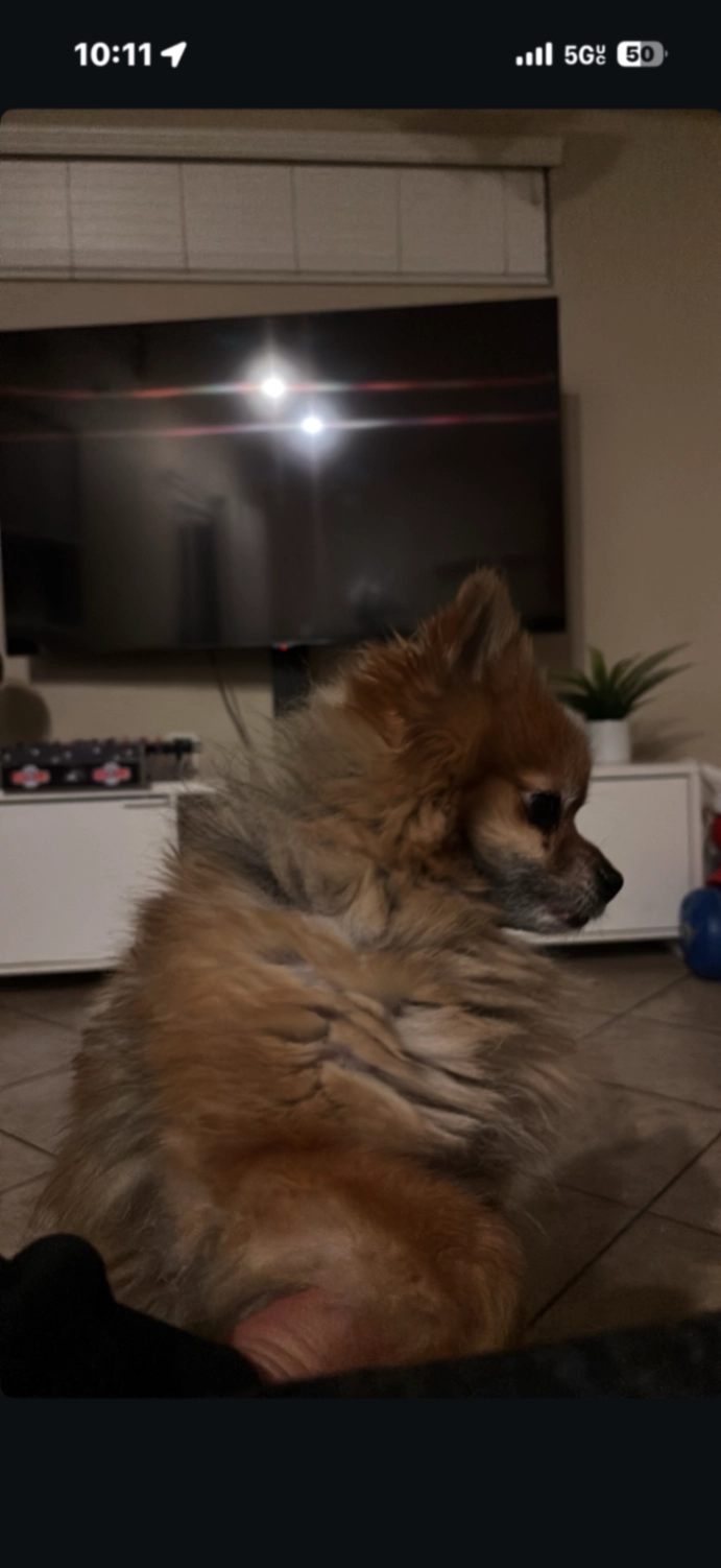 He is a tan and white corgi. He’s 12 and barks a lot at people. He doesn’t have a collar
