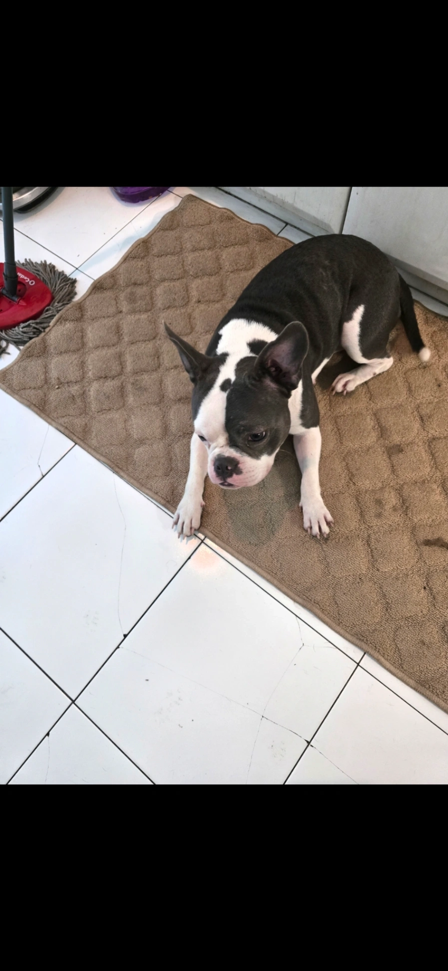 Female medium size dog looking much like a Boston terrier she is black and white.