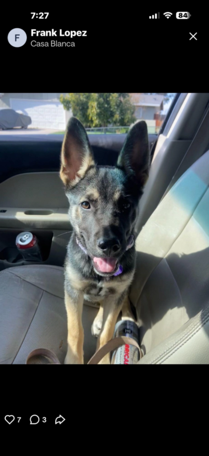 4 month old female German shepherd. She is wearing a purple collar and is microchipped . She is friendly