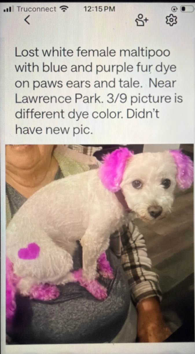 She had her fur dyed purple and blue recently. (Pet friendly color dye/non toxic)