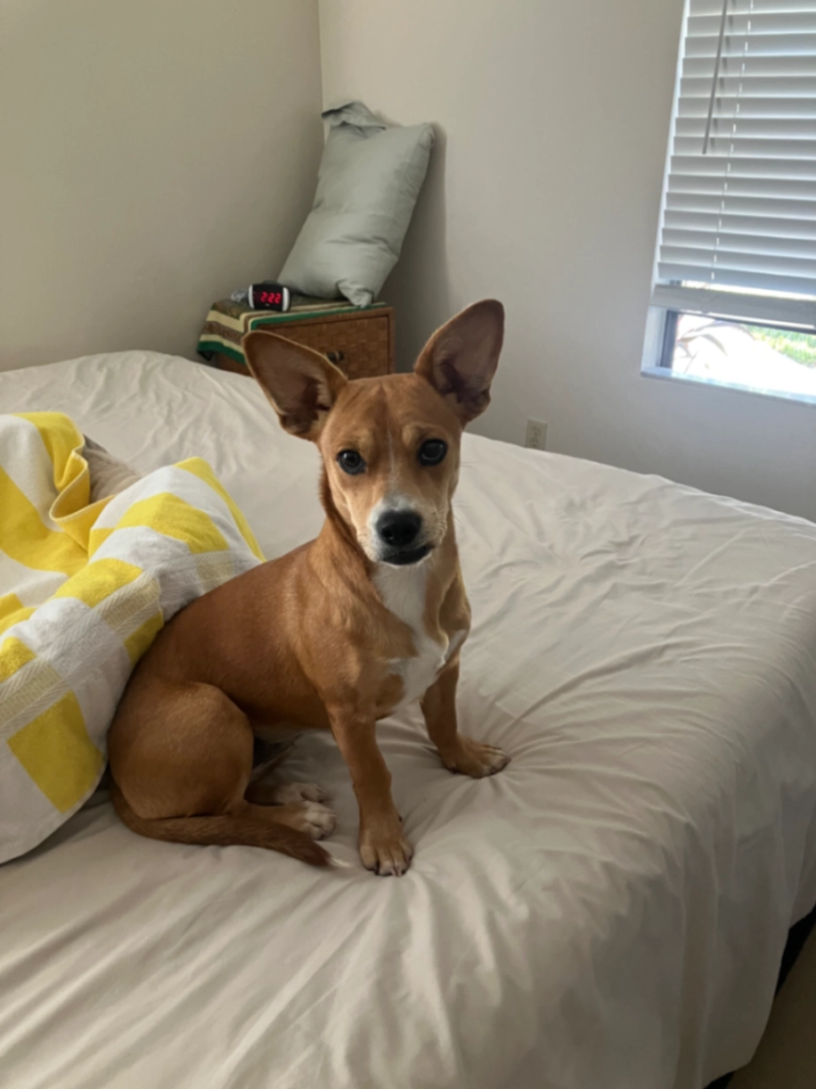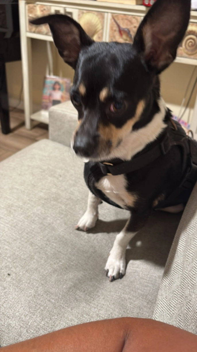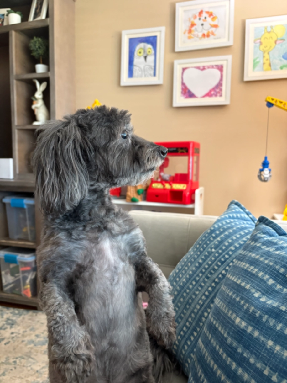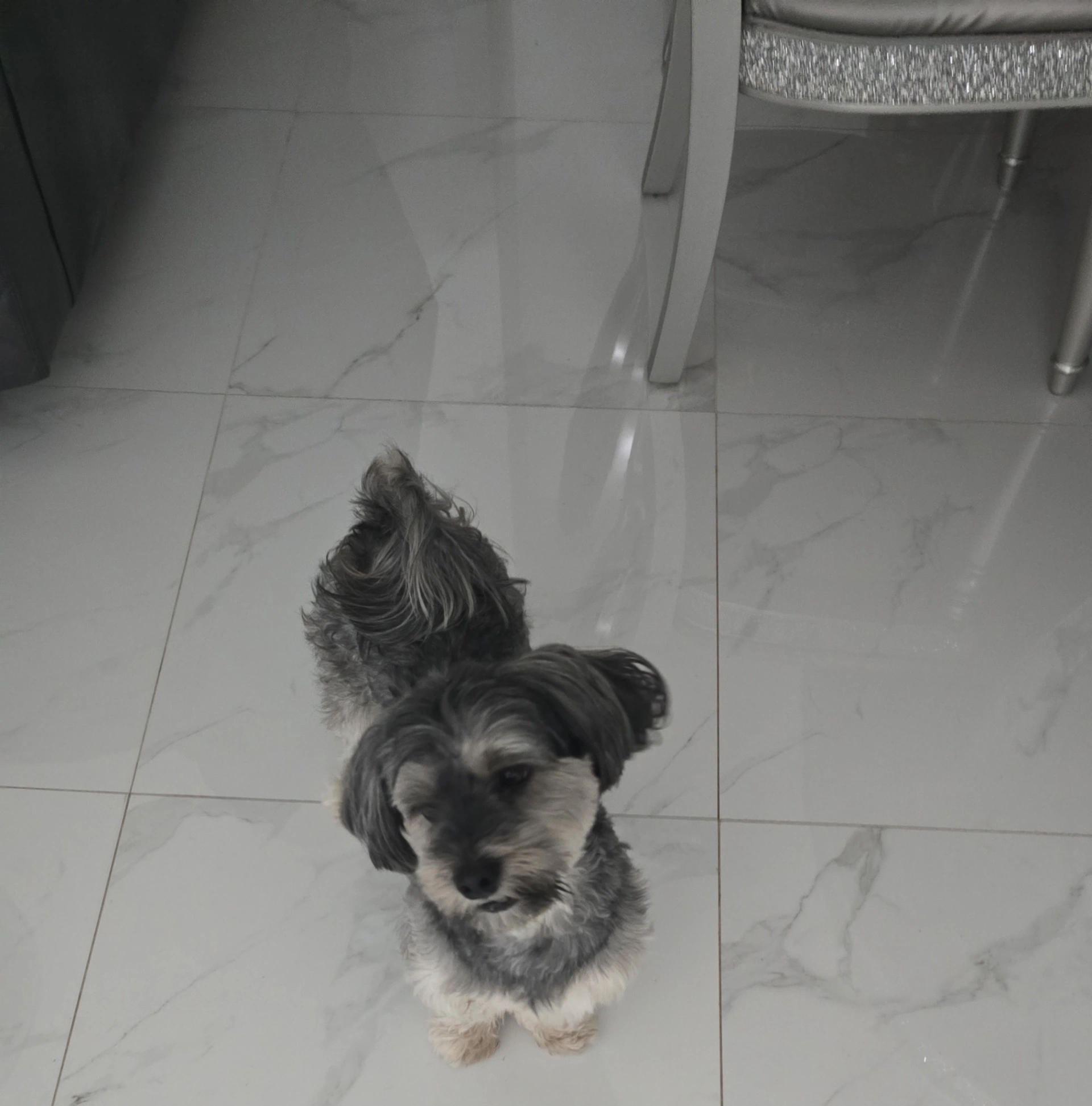 Belle is 15 pounds, sweet and friendly. She just got a haircut so her hair is pretty short right now. She she has blackish/grayish hair.